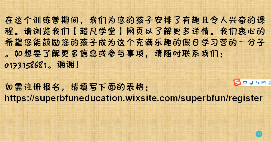 We have interesting and exciting programs lined up for your child(ren) during this camp. Please find attached details for the said camp. We hope you will encourage your child(ren) to be a part of this fun-packed Holiday Camp. For further information or participate in, please do not hesitate to contact us at 0173158681. Thank you!